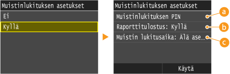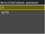 Jos haluat tallentaa vastaanotetut asiakirjat muistiin, valitse <Muistinlukituksen asetukset> -kohdassa <Kyllä>. Voit myös määrittää valinnaisia asetuksia, kuten turva-asetuksen, jota käytettäessä toiminto vaatii salasanan, ja aika-asetuksen, joka määrittää, mihin aikaan päivästä vastaanotetut asiakirjat tallennetaan muistiin.