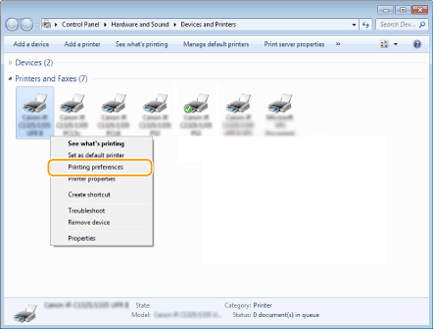 Napsauta faksin kuvaketta hiiren kakkospainikkeella ja valitse [Printing preferences] (Tulostusmääritykset).