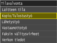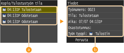 ![]() <Kopio/Tulostustyön tila>Näyttää luettelon kaikista asiakirjoista, joita käsitellään tai kopioidaan tai jotka odottavat käsittelyä.