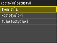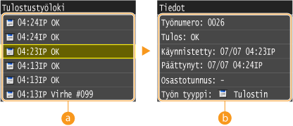 ![]() <Tulostustyöloki>Näyttää luettelon tulostetuista asiakirjoista. <OK> näytetään, kun asiakirjan tulostus onnistui, ja <Virhe>, kun asiakirjan tulostus epäonnistui, koska se peruutettiin tai tapahtui virhe.
