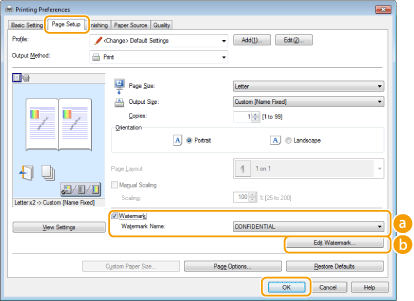 Valitse kukin välilehti ja määritä vesileiman teksti, väri ja tulostuskohta. Lisätietoja saat valitsemalla tulostinajurinäytön kohdan [Ohje].