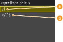 Valitse, vaihdetaanko tulostus A4- ja Letter-kokoisen paperin välillä, jos toista kokoa on lisätty, mutta toista ei. Jos esimerkiksi tulostat Letter-kokoisen asiakirjan, mutta laitteeseen on lisätty vain A4-kokoista paperia, laite tulostaa asiakirjan A4-kokoiselle paperille.