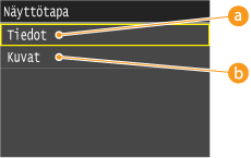 Voit määrittää oletusnäyttötavaksi joko <Tiedot> tai <Kuvat>.
