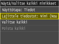 Voit määrittää lajittelujärjestyksen <Nimi (Nouseva)> tai <Päiväys/Aika (Nouseva)> tiedostojen lajittelujärjestyksen oletusarvoksi.