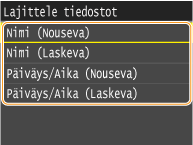Kun napautat kohtaa <Päiväys/Aika (Nouseva)> tai <Päiväys/Aika (Laskeva)>, tiedostot lajitellaan niiden muokkauspäivän ja -ajan mukaan.