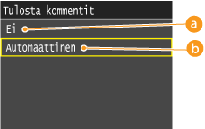 Tulostaa tummia värejä sisältävien merkkien, viivojen ja kaavioiden reunat tasaisina. Valitse <Tila 1>, kun haluat tulostaa normaalisti.