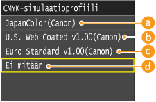 Jos jokin muu asetus kuin <Ei mitään> on valittu kohdassa <CMYK-simulaatioprofiili>, päälletulostusta ei käytetä.