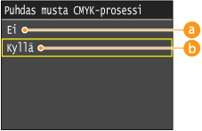 Jos <Ei mitään> on valittu kohdassa <CMYK-simulaatioprofiili>, Puhdas musta CMYK-prosessi -asetusta ei käytetä.