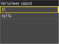 Tällä asetuksella voidaan ottaa käyttöön värinsäästötoiminto. Värinsäästötoiminto käyttää tulostamisessa tavallista vähemmän väriainetta, ja se voi pidentää väriaineen käyttöikää.