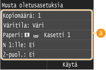 Oletusasetukset ovat asetuksia, jotka näytetään aina, kun kytket laitteeseen virran tai painat