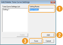 [Add/Delete Tone Curve Settings] (Lisää/Poista sävykäyräasetukset)- tai [Add/Delete Threshold Settings] (Lisää/Poista raja-arvoasetukset) -näyttö näytetään.