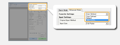 Jos valitset [Advanced Mode] (Tehokäyttötila) -välilehden ScanGear MF -näytössä, voit tehdä kuvan laatuun tarkempia säätöjä kuin yksinkertaisessa tilassa. Voit myös tallentaa säädetyt asetukset suosikeiksi. Lisätietoja saat napsauttamalla aiheen vieressä olevaa