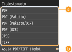 Voit valita tiedostomuodon, johon asiakirjat muunnetaan. Skannatut asiakirjat muunnetaan tässä määritettyyn tiedostomuotoon ja lähetetään määritetylle vastaanottajalle.