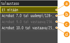 Voit asettaa salasanan ja suojaustason PDF-tiedoston salaamiselle.