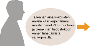 Tallenna osallistujien sähköpostiosoitteet ja tiedostomuoto <PDF (Pakattu)> yhdistelmänä kohtaan <Suosikkiasetukset>. Sitten voit käyttää tätä asetusyhdistelmää helposti aina tarvitessasi. Usein käytettyjen skannausasetusten tallentaminen (sähköposti/jaettu kansio/tiedostopalvelin)