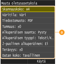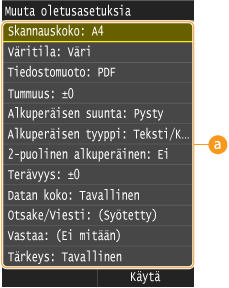 -painiketta. Jos muutat nämä oletusasetukset vastaamaan useimmin tekemiäsi toimintoja, sinun ei tarvitse määrittää samoja asetuksia uudelleen joka kerran, kun skannaat.