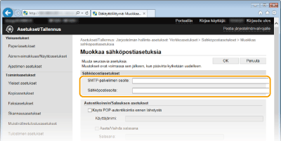 Käytä Etäkäyttöliittymää tarkkojen sähköpostiasetusten, kuten POP ennen SMTP:tä -todennus ja TLS-salaus, määrittämiseen. Lisätietoja vaadituista asetuksista saat Internet-palveluntarjoajaltasi tai verkon pääkäyttäjältä.