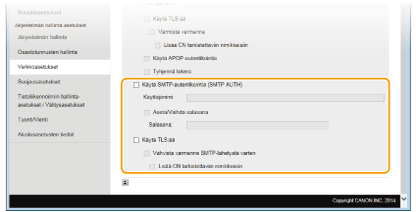 Valitse tämä valintaruutu, kun haluat käyttää TLS-salausta tiedonsiirrossa SMTP-palvelimen kanssa. Valitse valintaruutu [Vahvista varmenne SMTP-lähetystä varten] tai [Lisää CN tarkistettaviin nimikkeisiin] tarpeen mukaan.