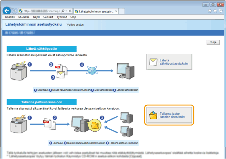 SMB:n määrittäminen). Kun haluat määrittää laitteen tallentamaan skannatut asiakirjat verkossa olevaan jaettuun kansioon SMB:n avulla, määritä jaetun kansion sijainti tietokoneesta käyttämällä Lähetystoiminnon asetustyökalu -ohjelmaa.