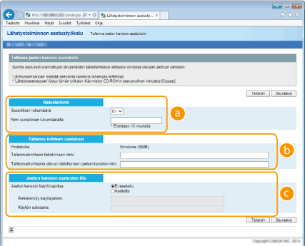 Lähetystoiminnon asetustyökalu -ohjelman avulla voit tallentaa jaetun kansion, johon skannatut asiakirjat tallennetaan osoitekirjan <Suosikit>-luetteloon. Valitse numero avattavasta luettelosta.