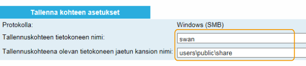 Syötä jaetun kansion nimi (tai polku). Jos esimerkiksi jaettu kansio on alikansio nimeltä "share" ja sijaitsee C-aseman [Public] (Julkinen) -kansiossa (polku: C:\users\public\share), syötä "users\public\share".