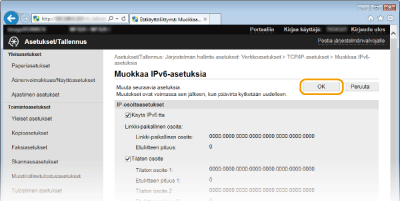 [Käytä IPv6:tta] -valintaruudun on oltava valittuna, että voit määrittää asetukset. IPv6-osoitteiden määrittäminen
