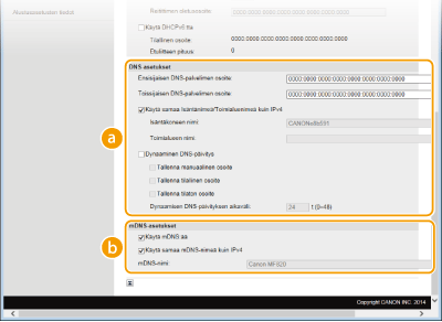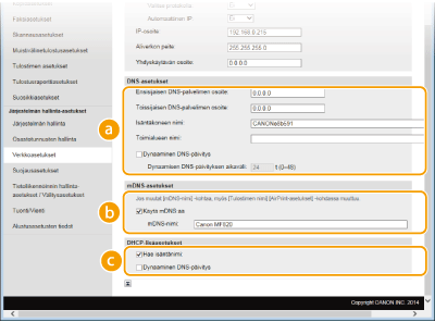 Valitse tämä valintaruutu, kun haluat, että DNS-tiedot päivitetään dynaamisesti aina, kun laitteen IP-osoite muuttuu. Määritä osoitetyyppi/-tyypit, jotka haluat tallentaa DNS-palvelimelle, valitsemalla valintaruutu [Tallenna manuaalinen osoite], [Tallenna tilallinen osoite] tai [Tallenna tilaton osoite]. Määrittääksesi päivitysten välisen ajan, syötä aika tunteina [Dynaamisen DNS-päivityksen aikaväli] -kenttään. [mDNS-asetukset][Käytä mDNS:ää:]