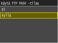 PASV-tilan käyttäminen FTP-palvelimessa riippuu käytössä olevasta verkkoympäristöstä sekä asetuksista tiedostopalvelimessa, johon tietoja lähetetään. Ennen kuin määritä FTP:n PASV-tilan, ota yhteyttä käyttämäsi verkon pääkäyttäjään.