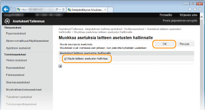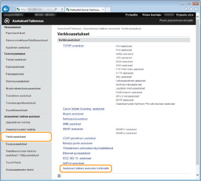 Erityisen portin asetus ja SNMP-asetus (SNMPv1 tai SNMPv3) on otettava käyttöön iW Management Console -ohjelmiston lisäosan kanssa kommunikoimiseksi. Valitse [Luku/Kirjoitus] (täydet käyttöoikeudet) SNMP-asetusten (SNMPv1 tai SNMPv3) kohdassa [MIB-pääsyoikeus]. Nimetyn portin asetukset Laitteen valvonta ja ohjaus SNMP:n avulla
