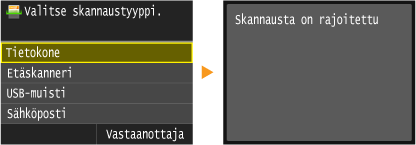 Jos [Rajoita skannausta] -valintaruutu on valittu, asiakirjojen skannaaminen USB-muistilaitteisiin, sähköpostiin, jaettuihin kansioihin ja tiedostopalvelimille on poistettu käytöstä. Voit myös poistaa käytöstä asiakirjojen skannaamisen tietokoneelle laitteiden <Tietokone> ja <Etäskanneri> kautta. Voit kuitenkin poistaa käytöstä asiakirjojen skannaamisen tietokoneelle vain niin, että se koskee kaikkia käyttäjiä ( Töiden estäminen, kun osastotunnus on tuntematon).