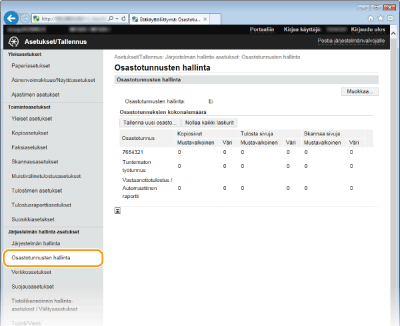 Voit tarkistaa kunkin osastotunnuksen kopioitujen, tulostettujen, skannattujen tai faksattujen sivujen kokonaismäärät.