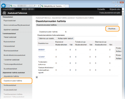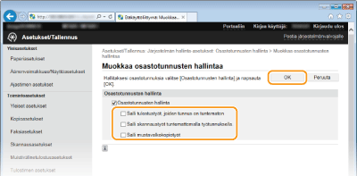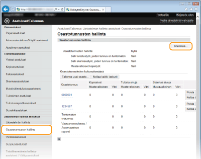 Tallenna osastotunnus ja aseta sille PIN-koodi. Voit myös poistaa osastunnuskohtaisesti toimintoja käytöstä, esimerkiksi mustavalkoisen kopioinnin tai väritulostuksen. Enintään 300 osastotunnusta voidaan tallentaa.