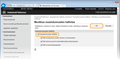 Valitse [Käytä osastotunnusten hallintaa] -valintaruutu ja sitten sen oikealla puolella oleva kohta [Asetukset].