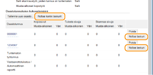Jos haluat nollata laskurit, napsauta vastaavaa tekstilinkkiä kohdassa [Osastotunnus] ja valitse [Nollaa laskuri]  [OK]. Jos haluat nollata kaikkien osastotunnusten laskurit, valitse [Nollaa kaikki laskurit]  [OK].