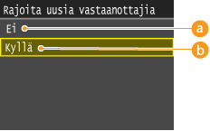 Rajoittamalla asiakirjojen lähetykseen käytettävissä olevia faksinumeroita niihin, jotka on jo tallennettu osoitekirjaan tai joita on käytetty aiemmin tai jotka voidaan hakea LDAP-palvelimilta, voit pienentää mahdollisuutta valita vääriä vastaanottajia sekä estää käyttäjiä vuotamasta tietoja. Kun tämä toiminto on käytössä, laite estää käyttäjiä syöttämästä vastaanottajia numeropainikkeilla, lisäämästä uusia tietoja osoitekirjaan ja muokkaamasta olemassa olevia osoitekirjan tietoja.