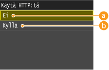 HTTP:tä käytetään tiedonsiirtoon verkon kautta, esimerkiksi silloin, kun laitetta käytetään Etäkäyttöliittymällä. Jos käytät USB-yhteyttä tai et muuten käytä HTTP:tä, voit poistaa HTTP:n käytöstä ja näin estää kolmannen osapuolen hyökkäykset käyttämättömän HTTP-portin kautta.