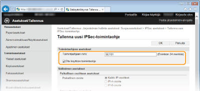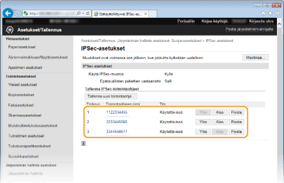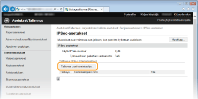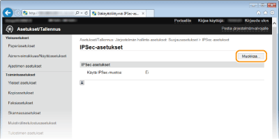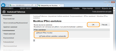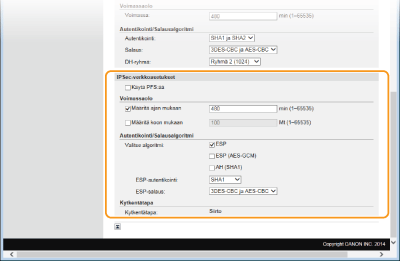 Voit ottaa IPSec-tiedonsiirron käyttöön tai poistaa sen käytöstä kohdassa <Valikko>. Käytä IPSec-muotoa