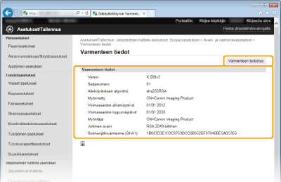 Varmenteen tiedot näytetään tässä näytössä.