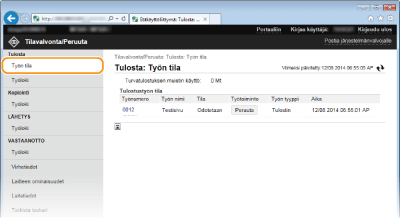 Valitse pysäytetyn asiakirjan tai turvatulostusasiakirjan [Työnumero], jos haluat nähdä tarkat tiedot. Voit tarkistaa tulostetun asiakirjan käyttäjänimen ja sivumäärän.