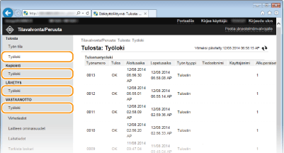 Tulostettujen, kopioitujen, faksilla/sähköpostilla lähetettyjen (TX) tai faksilla vastaanotettujen (RX) asiakirjojen historiasta näytetään enintään 128 työtä.