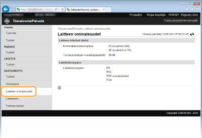 Suurin tulostusnopeus ja turvatulostuksen muistikapasiteetti näytetään.