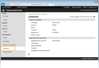 Tiedot laitteesta ja järjestelmänvalvojasta näytetään. Nämä tiedot asetetaan [Asetukset/Tallennus]-sivun kohdassa [Järjestelmän hallinta].