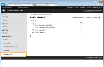 Kokonaissivumäärä, joka on tulostettu tulostus-, kopiointi- ja faksitoiminnoilla, näytetään.