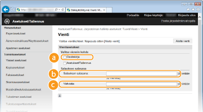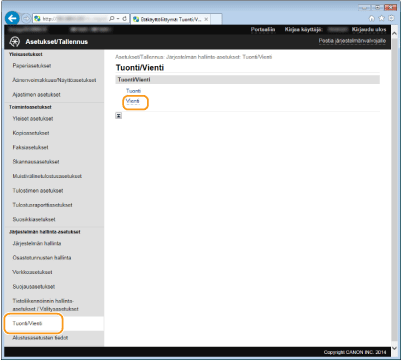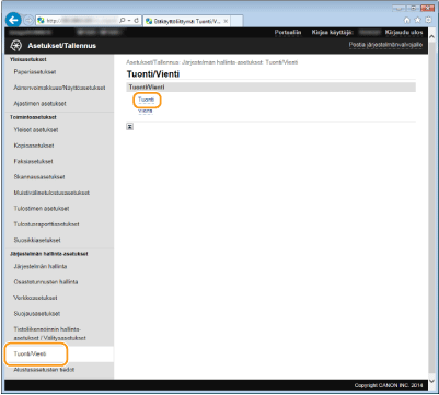 Osoitekirjan lataaminen poistaa aiemmin tallennetut <Suosikkiasetukset> kohdista <Faksi>, <Skannaus> jne.