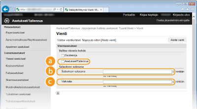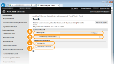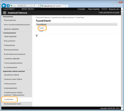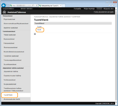Voit tallentaa valikkovaihtoehtojen asetusten tiedot tietokoneeseen tai rekisteröidä tallennetut tiedot laitteeseen. Viedyt tiedot voidaan tuoda. Jos käytössä on sama malli, toisiin laitteisiin voi tuoda tietoja, jotka on viety tästä laitteesta, ja päinvastoin. Voit tehdä nämä toiminnot vain, kun olet kirjautunut sisään järjestelmänvalvojan tilassa.