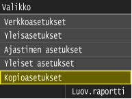 Kaikki kopioinnin asetukset ja lyhyet kuvaukset luetellaan. Oletusasetukset on merkitty tikarilla (