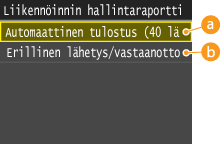 Voit tarkistaa lähetettyjen ja vastaanotettujen faksi- ja sähköpostiasiakirjojen lokit tulostamalla liikennöinnin hallintaraportin. Raportti voidaan tulostaa automaattisesti aina 40 tapahtuman jälkeen tai voit tulostaa sen manuaalisesti.