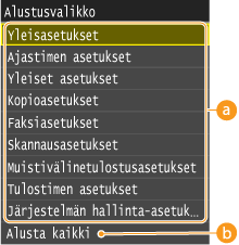 Jos haluat alustaa <Verkkoasetukset> ja <Järjestelmän hallinta-asetukset>, katso kohta Järjestelmän valvonnan asetusten alustaminen.