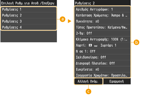 Μπορείτε να καταχωρίσετε έως τέσσερις συνδυασμούς ρυθμίσεων αντιγραφής που χρησιμοποιούνται πιο συχνά. Επιλέγοντας απλώς έναν καταχωρισμένο συνδυασμό ρυθμίσεων, όποτε είναι αναγκαίο, δεν χρειάζεται να καθορίζετε τις ίδιες ρυθμίσεις κάθε φορά που αντιγράφετε. Για παράδειγμα, εάν ορίζετε συχνά τον αριθμό αντιγράφων στο 5, μπορείτε να ορίσετε τη ρύθμιση <Διαγραφή Πλαισίου> σε <On> και να αυξήσετε την όξυνση κατά την αντιγραφή. Μπορείτε να καταχωρίσετε τους συνδυασμούς ρυθμίσεων με οποιοδήποτε όνομα.