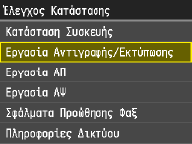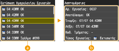![]() <Εκτύπωση Ημερολογίου Εργασιών>Εμφανίζει μια λίστα των εγγράφων που έχουν εκτυπωθεί. Εάν η εκτύπωση ενός εγγράφου ολοκληρωθεί με επιτυχία, εμφανίζεται το μήνυμα <OK>. Εάν δεν εκτυπωθεί το έγγραφο, επειδή ακυρώθηκε η εκτύπωση ή παρουσιάστηκε κάποιο σφάλμα, εμφανίζεται το μήνυμα <Σφάλμα>.